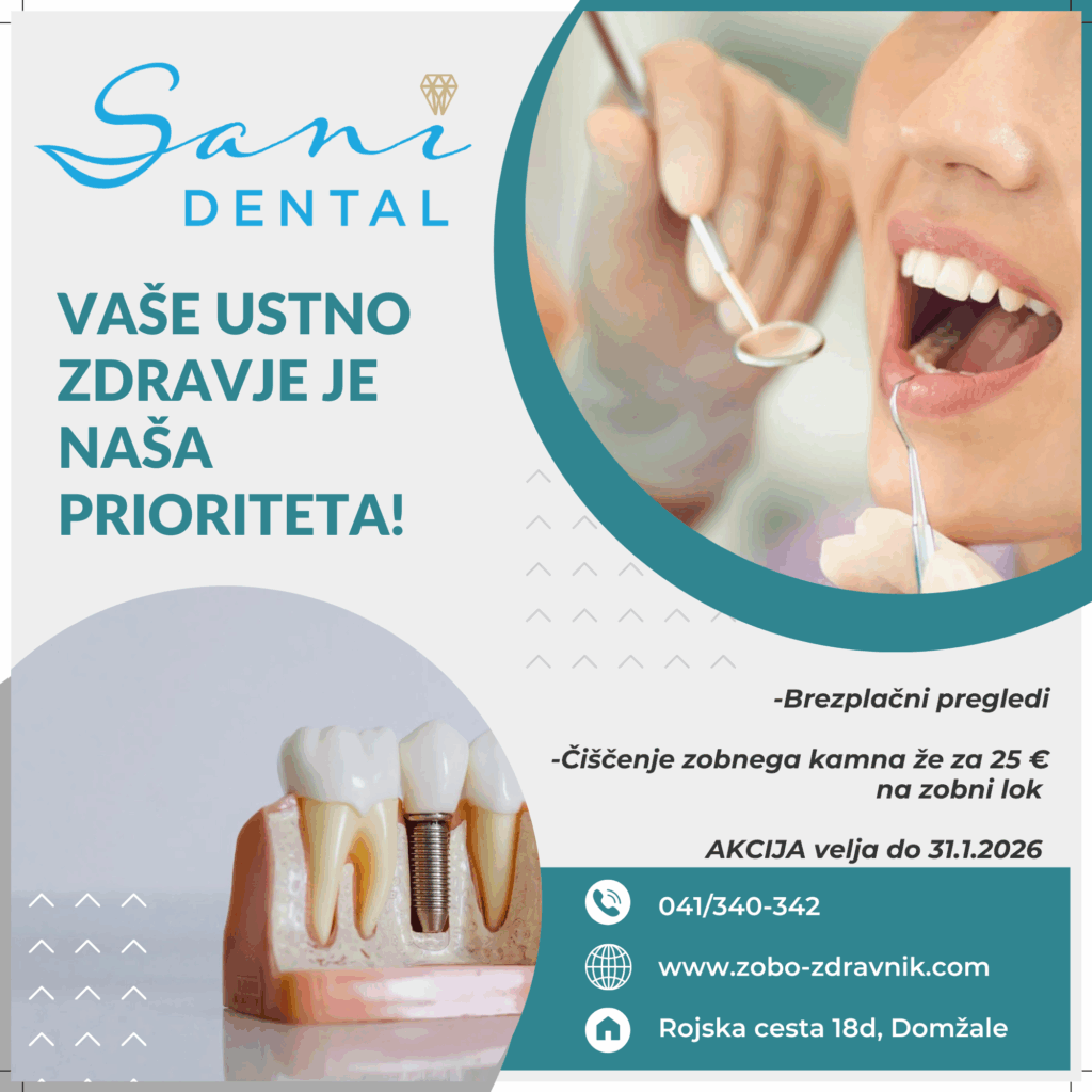 Vaše ustno zdravje je naša prioriteta, zato vam prisluhnemo, upoštevamo vaše želje in strahove ter se maksimalno prilagodimo. Za vas izberemo najbolj optimalen načrt dentalnega zdravljenja, oziroma optimalno obliko estetskega tretmaja obraza, zato poskrbite zase, poskrbite za zdrav in lep nasmeh ali videz v dentalnem studiju Sani Dental.